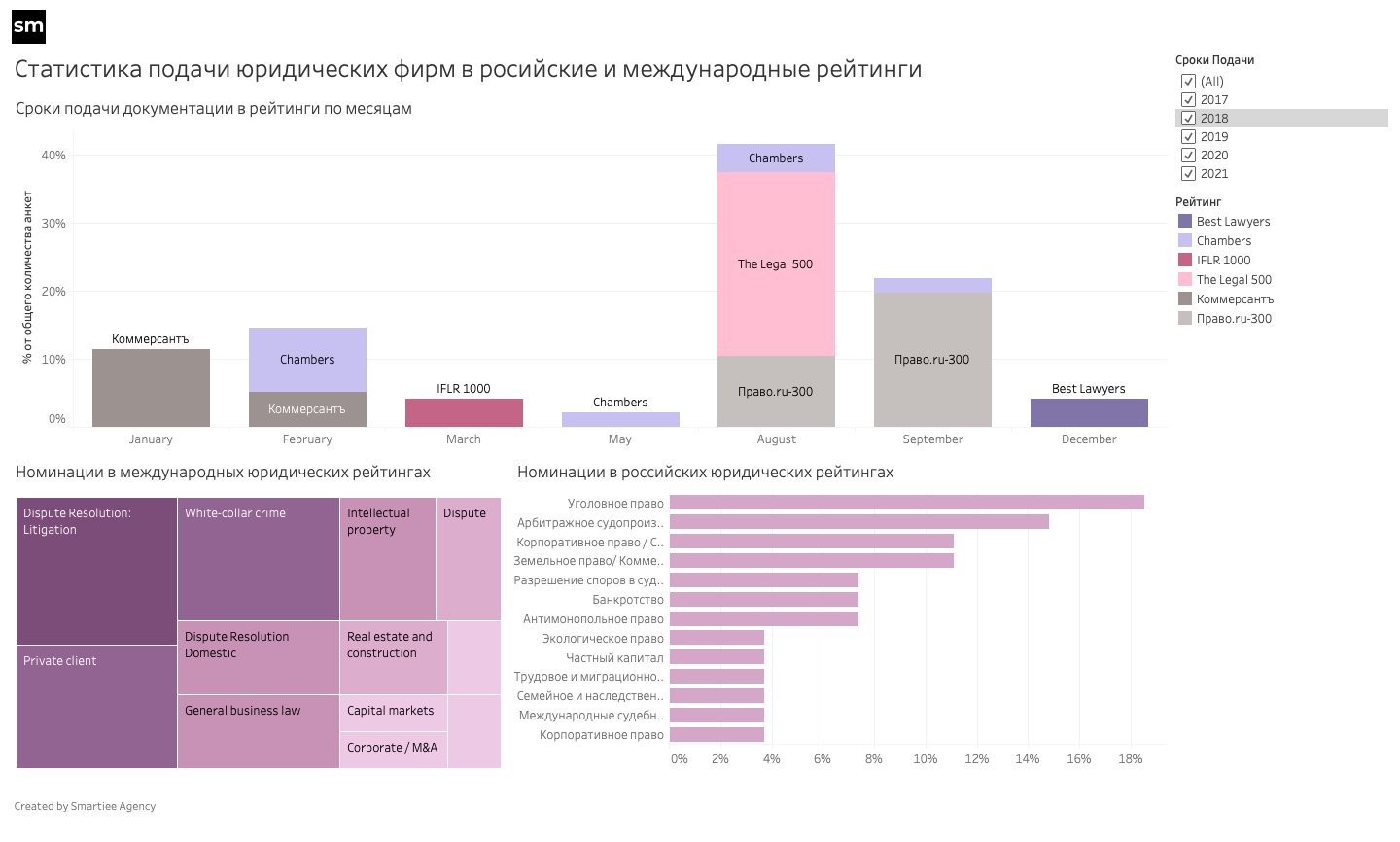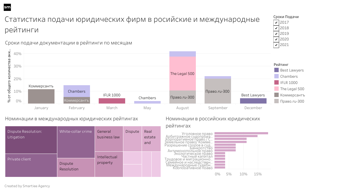 Как видно из графиков, специалисты практики юридического маркетинга имеют большой опыт по подаче заявочной документации в номинации международных рейтингов:
