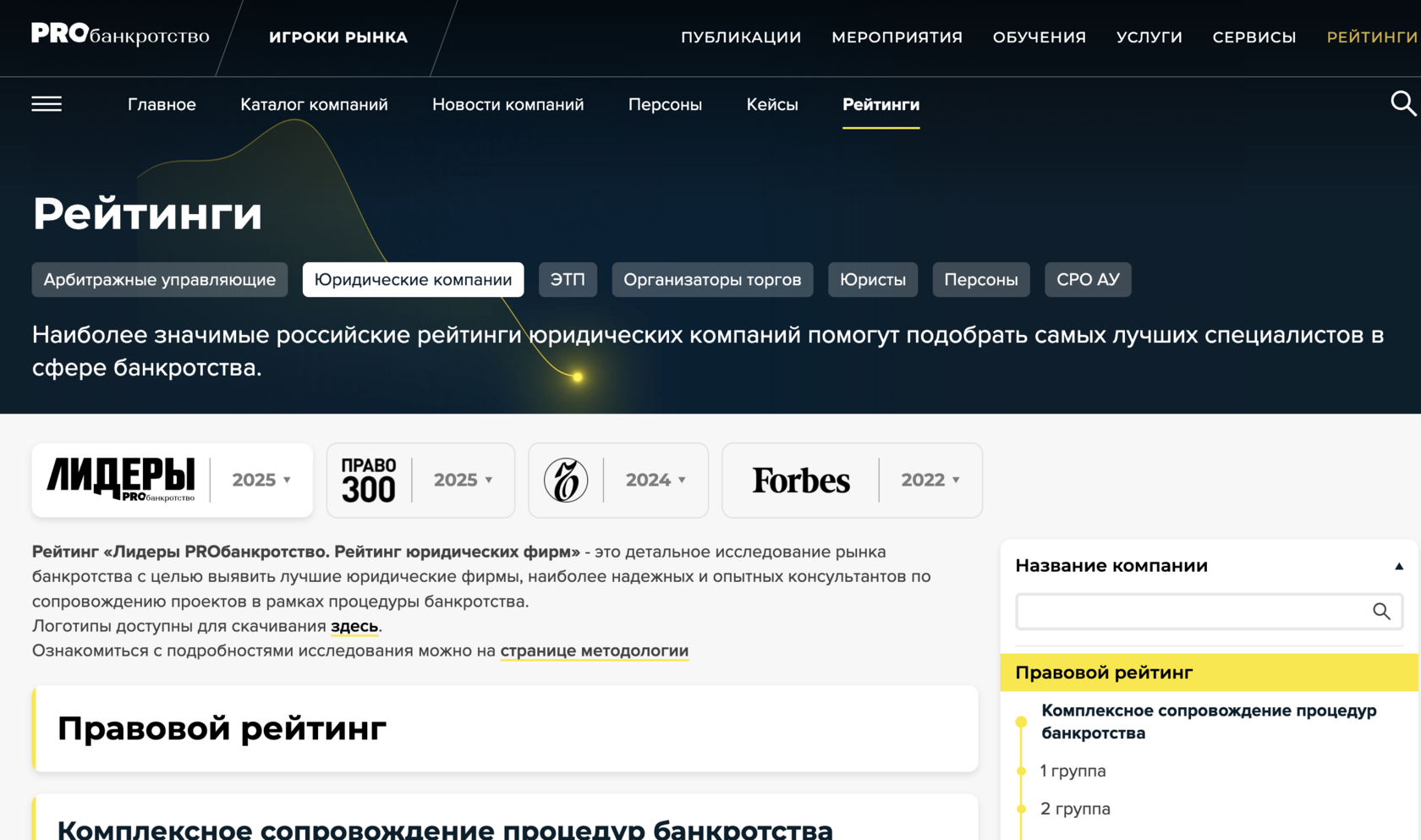 "Лидеры PROбанкротство".Критериями оценки послужили качество услуг юридической фирмы, уровень сервиса, уровень экспертизы. В рейтинге отмечены как крупные компании с несколькими сотнями юристов, как например Nextons, ЕПАМ, Меллинг, Войтишкин и партнеры, так и небольшие участники рынка.