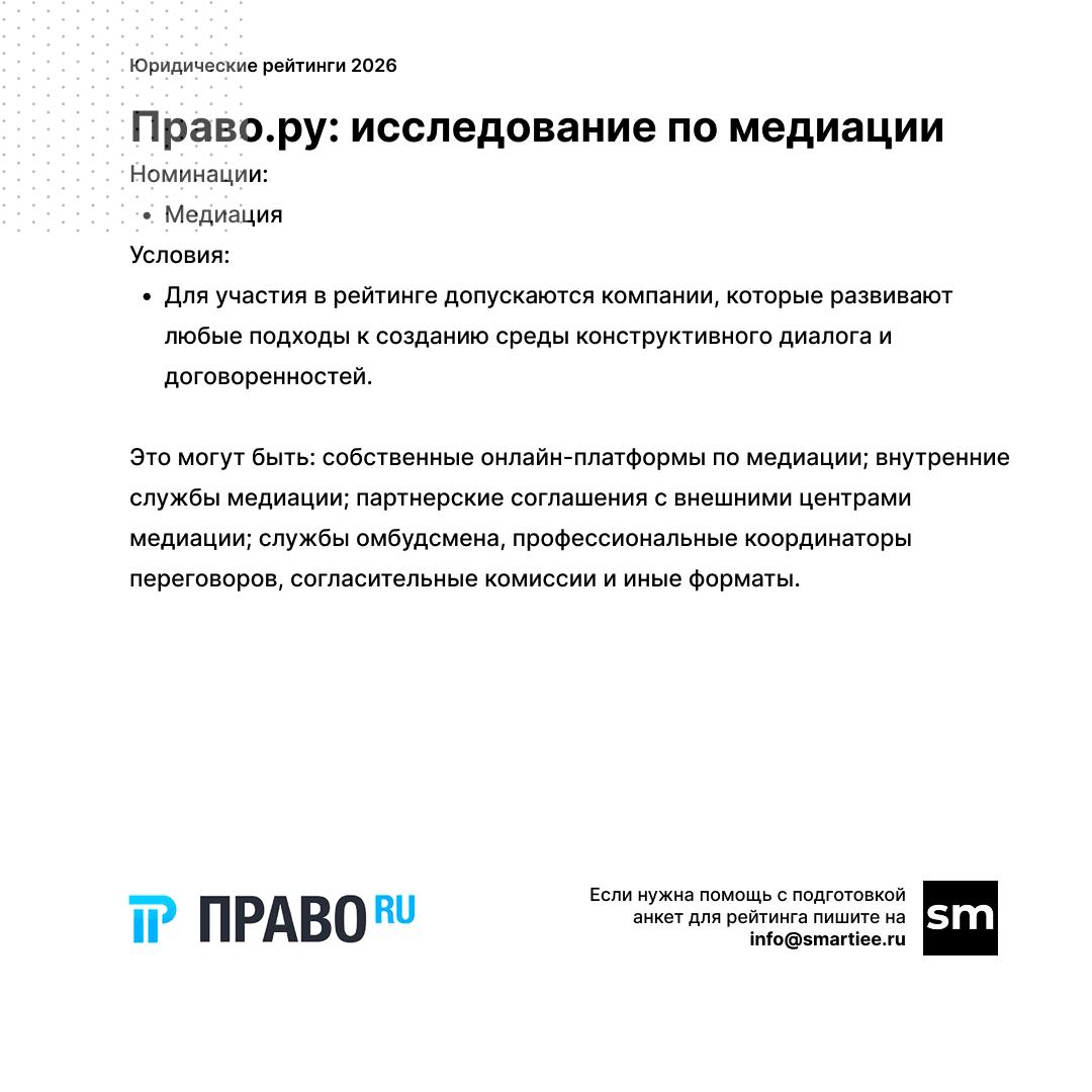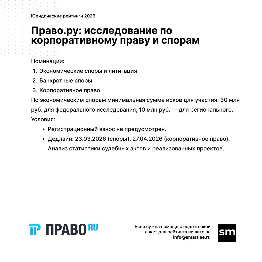 •С начала года стартовали специализированные исследования Право.ру по направлению споров, корпоративного права и медиации. Из плюсов - не требуется регистрационный взнос и после анализа высокая вероятность, что ваша компания будет опубликована в списке рекомендованных фирм. Внимательно ознакомьтесь с условиями: суммы исков по спорам должны быть выше 30 млн рублей.