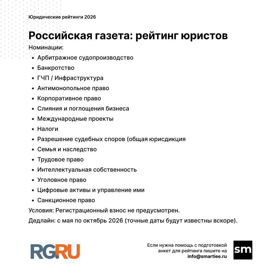 •Скоро начнется подача в юридический рейтинг Российской газеты (обычно с мая). Регистрационный взнос не предусмотрен.
